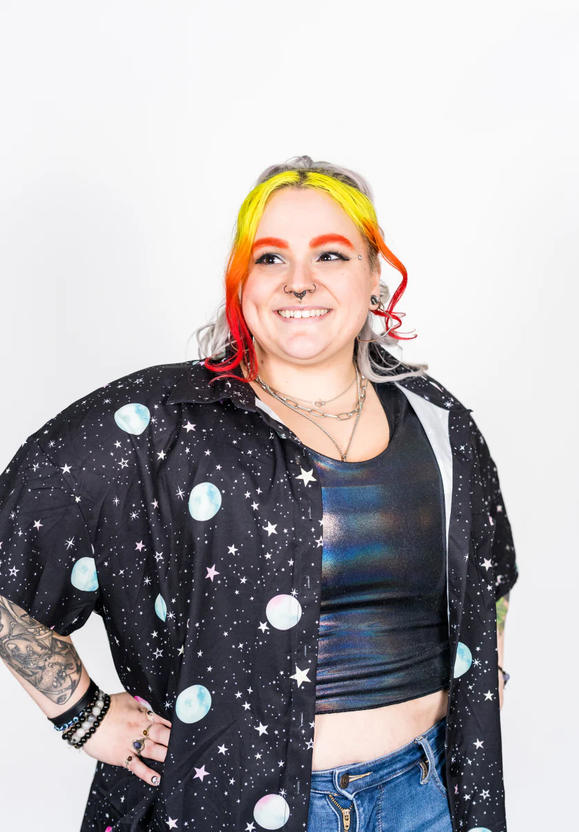 Holographic prints that show the full spectrum! Be the rainbow. Reflect it onto everyone around you. Dazzle them all.